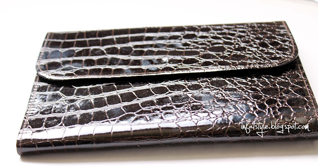 Die Pinseltasche kommt in einer eleganten Krokoleder Optik daher, schön schlicht in Braun gehalten. Sie lässt sich mit einem Druckknopf schließen, was aber jedoch nicht verhindert das ALLE Pinsel rausfallen. Es ist eine nette Beigabe zu den Pinseln, aber für mich dadurch unbrauchbar. Sie hat noch extra Fächer, wo man sehr kleine Kleinigkeiten verstauen kann.