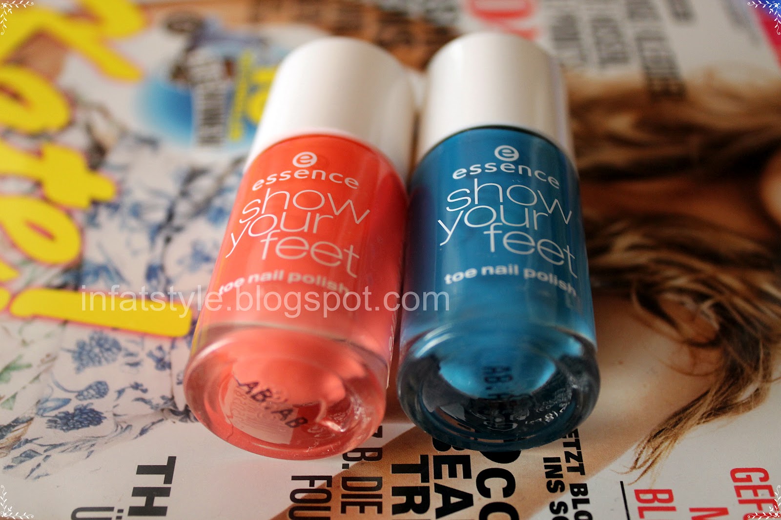 | Zuerst einmal suchen wir uns 2 Farben aus um einen Ombre Effekt zu erzielen. Hier zu sehen: Essence Show your Feet 24 coral me beautiful, 23 underwater love. |