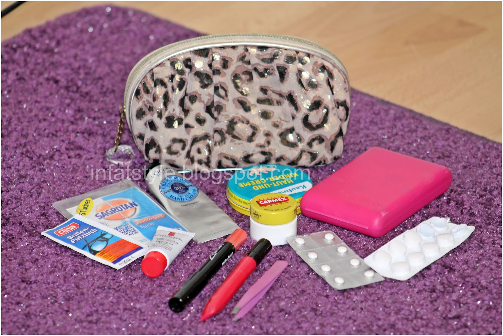 | Kosmetiktasche: Primark//Desinfektion: Apotheke//iPhone//Brille: Fielmann//Emmi Nails SOS Feile//Schlüssel//MP3 Player: Phillips |