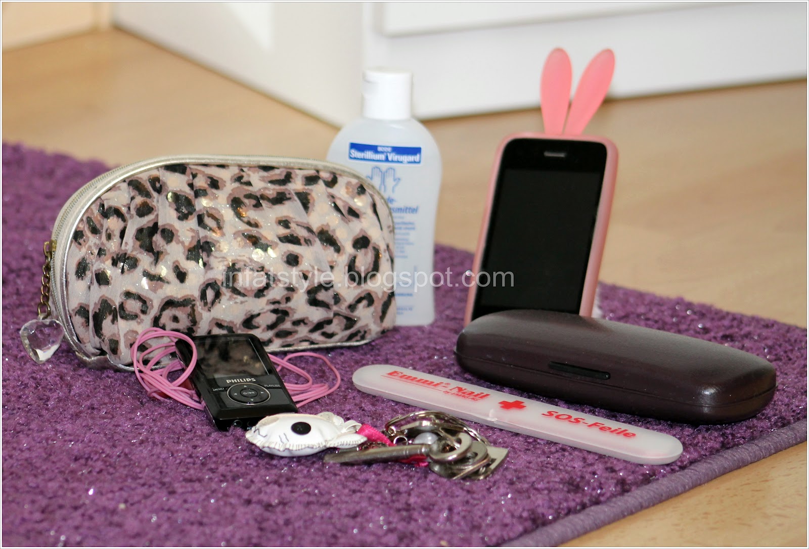 Kosmetiktasche: Primark//Desinfektion: Apotheke//iPhone//Brille: Fielmann//Emmi Nails SOS Feile//Schlüssel//MP3 Player: Phillips |