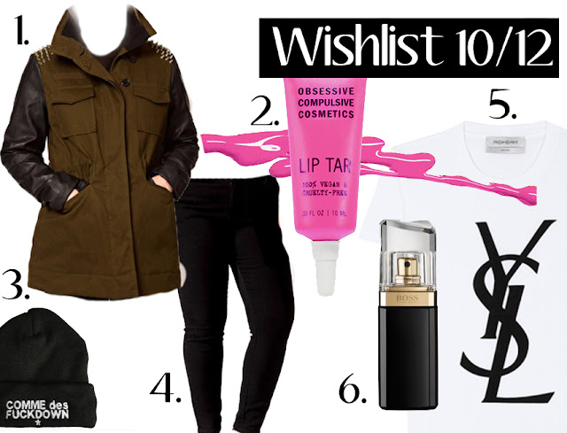 1.Asos Curve-Jacke im Military-Stil mit nietenbesetzten Schultern, 119,98€. 2. Obssesive Compulsive Cosmetics Nylon Lip Tar, 16$. 3.Comme des Fuckdown Hat, 12,99 Pounds. 4.Kurze Streck Skinny Jeans, 21,75€. 5.Yves Saint Laurent Logo Shirt, 245€. 6.Boss Nuit Pour Femme 30ml, 47,95€.