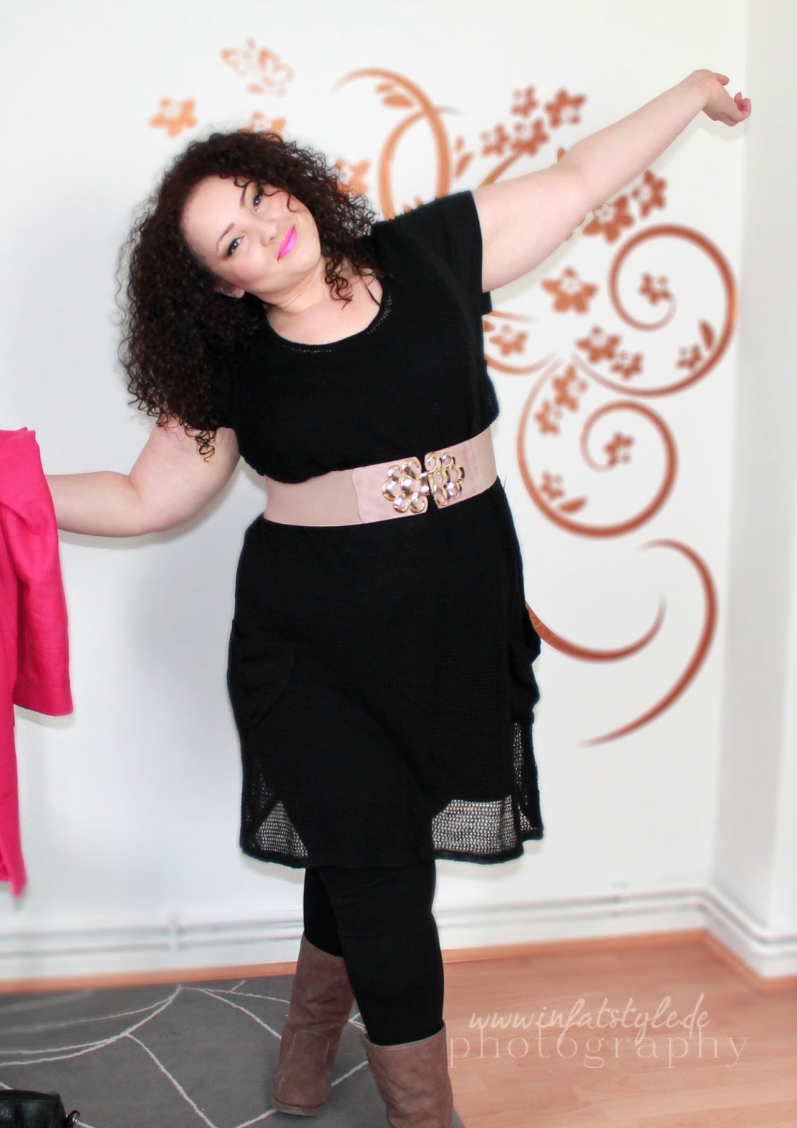 Damit das Signal ganz deutlich zu erkennen ist, habe ich alles mit Schwarz kombiniert. Ich trage hier eine schwarze Leggings, ein Basic Kleid, und ein Netz-Kleid welches ich an der Taille mit einem Beigen Gürtel halte. Leider weicht der Beige Ton sehr von meinen „beigen“ Stiefeln ab, aber es ist so kalt die müssen mit.