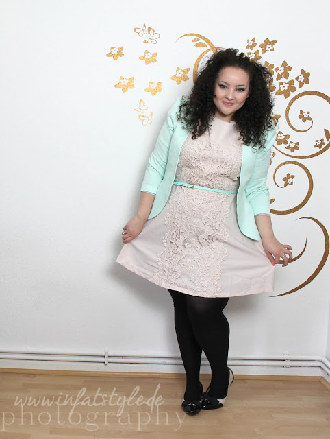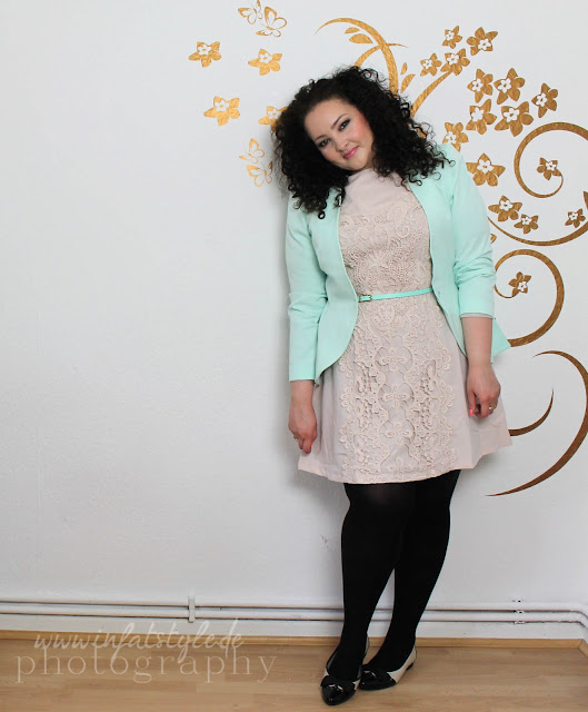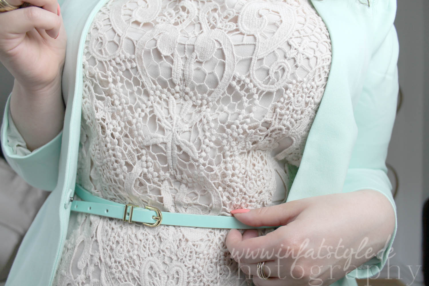 Seit einigen Wochen schmachte ich bereits dieses nude-farbene Kleid von AX PARIS an, die feine Spitze hat es mir ziemlich angetan. Es ist viel schöner als die Shop-Bilder es vermuten lassen. Da meine Größe schon früh vergriffen war, entschied ich mich für eine Nummer größer. Kombiniert habe ich das Kleid mit einer blickdichten Strumpfhose von H&M, dazu diese zuckersüßen Schuhe von HSE24 die sich wundervoll in das Outfit integriert haben. Um ein bisschen Farbe rein zu bringen habe ich mich für einen Blazer von H&M (leider ausverkauft) und einen Gürtel von Asos in der Farbe mint entschieden.