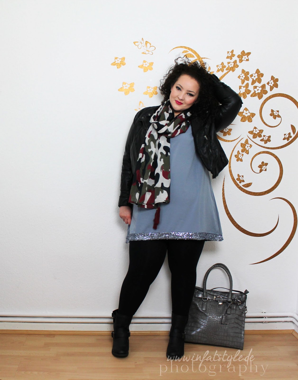 Ihr merkt, die Schwierigkeit dieser Tunika diese zu stylen. Da kommt auch noch die Farbe ins Spiel. Ich besitze rein gar nichts in meinem Schrank was auch annähernd dem Blau-Grau entspricht. Da schwarz bekanntlich zu allem passt, habe ich mich für die sportliche Variante entschieden. Aufgepeppt habe ich das Outfit mit dem schönen Camouflage Schal den es am August bei Via Appia in der Herbst-Kollektion zu kaufen gibt. Passend dazu habe ich einfach einen Lippenstift in der Farbe des rot-tons im Schal gewählt.