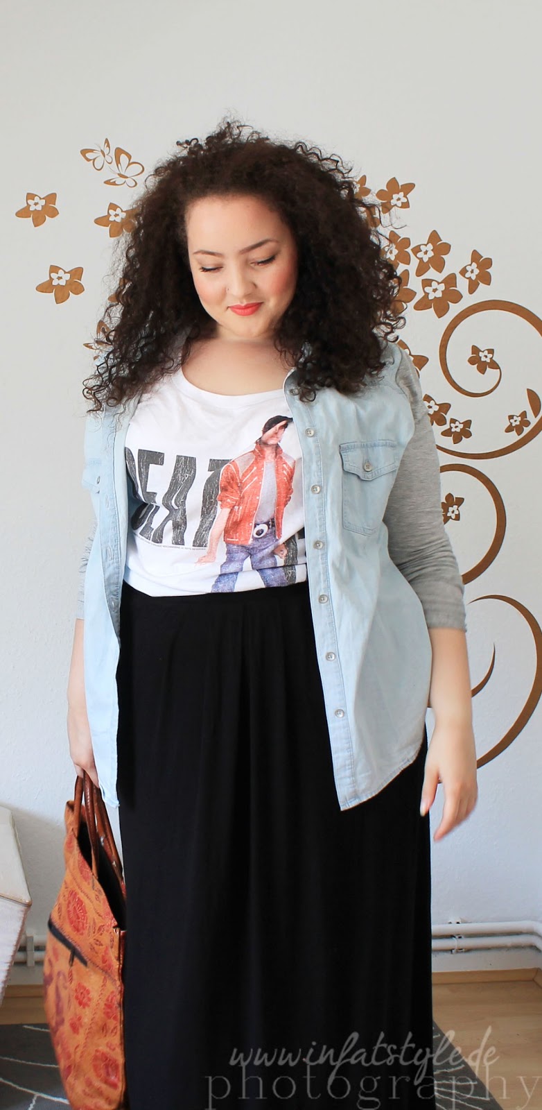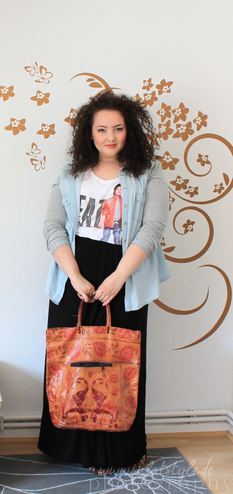 Das Michael Jackson T-Shirt stecke ich lässig in den Maxi-Rock um das Outfit die nötige Leichtigkeit zu geben. Dadurch kommt aber auch wieder die Taille in den Vordergrund und der Bauch wird umspielt. Das Jeanshemd, ist nur zum Schutz falls eine Kühlung eintritt, die ja eigentlich nicht zu befürchten ist, aber man weiß ja nie was kommt…. Sicher ist nun mal sicher!