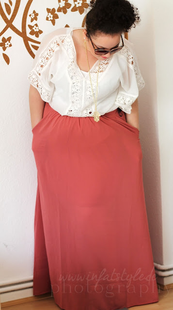 Ich find das Outfit total toll, schöne Farbe hat der Rock, auch wenn er mir ein kleines bisschen zu transparent ist. Und die Bluse ist so schön!