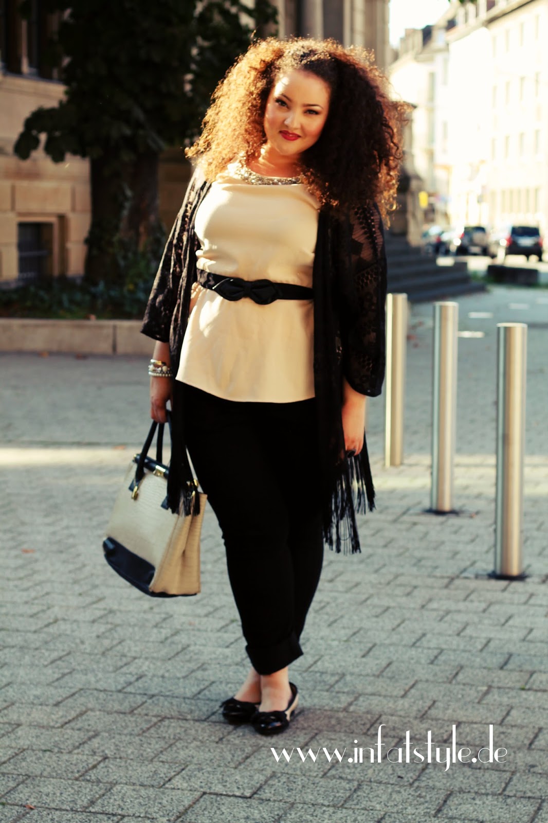 Die Bilder, die draußen geschossen werden, sind schöner. Allein wie die Sonne auf deine Lockenpracht scheint, ist toll. Deine Kombi ist super und der Kimono gibt mit dem Fransen und das Lochmuster einen besonderen Highlight. Dein Peplum Top mit dem tollen Kragen ist klasse. Bin total begeistert von deiner Kombi!