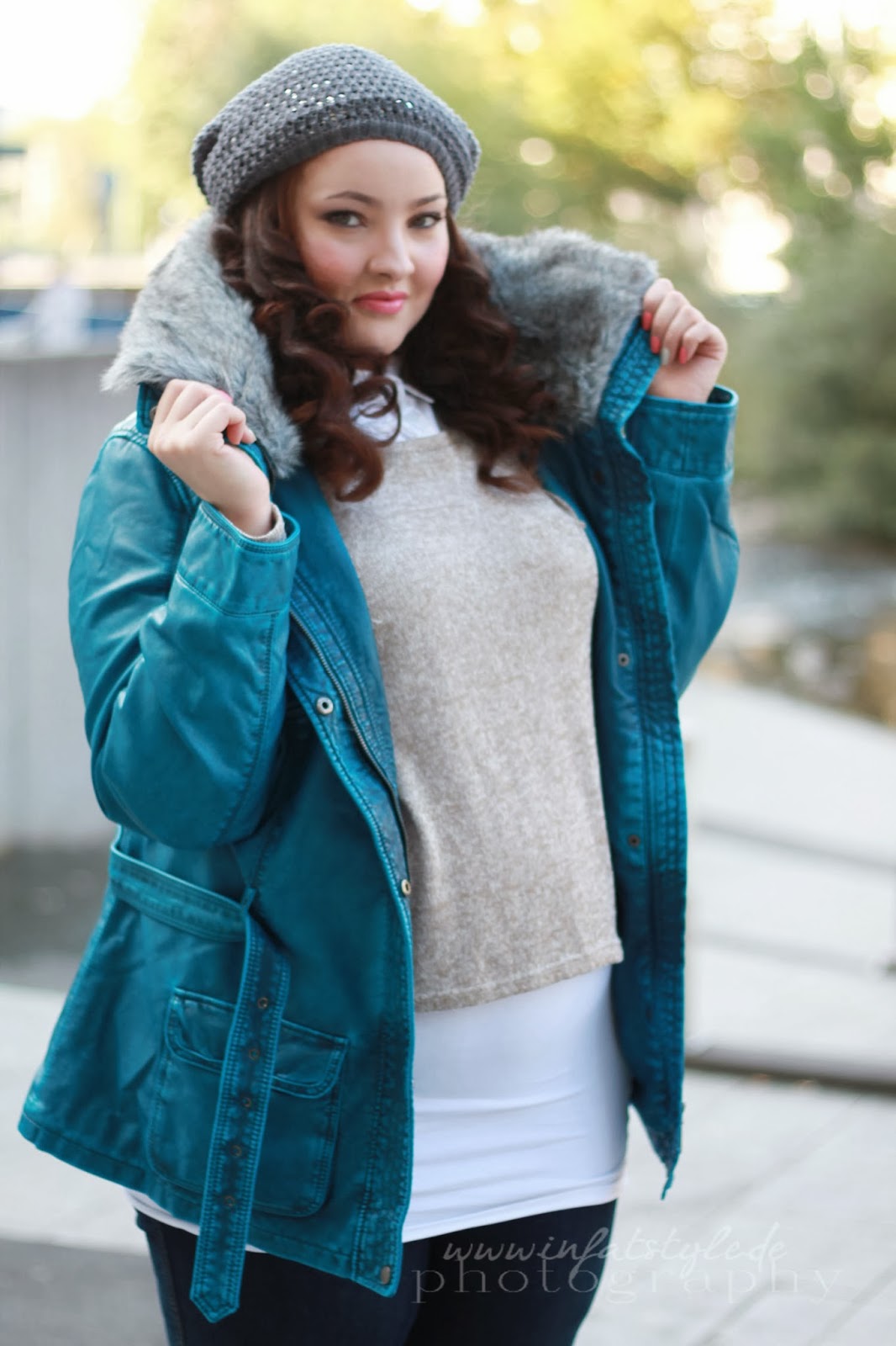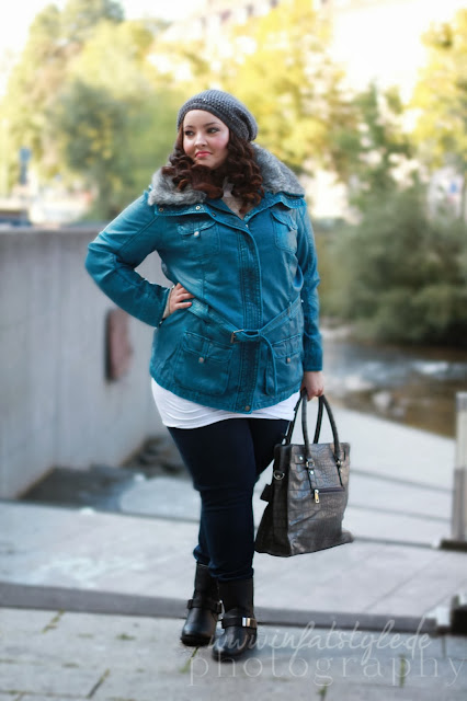 Ein paar von euch waren ja ganz interessiert an der Jacke die ich euch im letzten Video ganz kurz vorgestellt habe. Die Farbe würde ich als Petrolblau bezeichnen mit einem starken used-look. Ich empfinde die Farbe als besonders auffällig, da durch den used-Look das Petrol verstärkt wird. Das schöne an der Jacke ist natürlich für mich die Einzigartigkeit. Ganz ehrlich, selten so ein Teil in einem Plus Size Shop in Deutschland gesehen. Ich mag den pelzigen Kragen, die auffällige Farbe und den besonderen Schnitt. Was mir nicht gefällt ist dass der Gürtel etwas tiefer liegt als die Taille, wodurch meiner Meinung nach der Hüftspeck besonders hervor gehoben wird. Ob das sein muss, oder kann, darüber lässt sich streiten. Mich stört es nur das ich den Gürtel auf meiner Hüfte spüre, da die Hüfte besonders häufig beim gehen in Bewegung ist. Das ist aber nur Erbsenzählerei, und mit Sicherheit nur meine eigene Wahrnehmung. Nichts desto trotz mag ich die Jacke gern tragen.