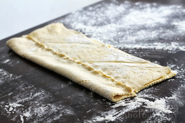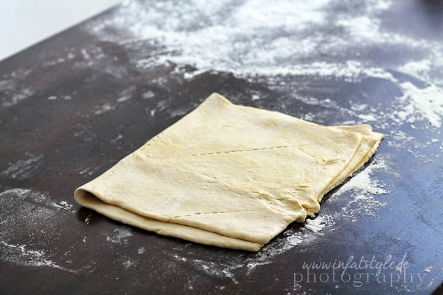 Das Quadrat wird einmal gefaltet und zu einem 4 mm dicken Teig ausgerollt. Das ganze wird ein zweites und ein drittes Mal wiederholt.