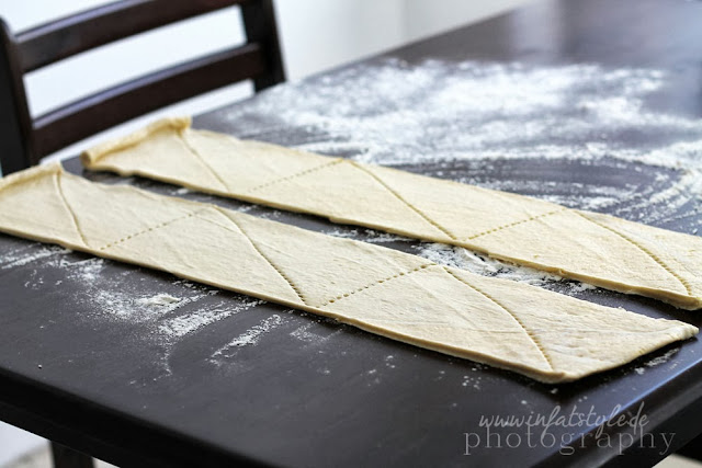 Zunächst legen wir die zwei rollen Backteig auf einer bemehlten Fläche aus. Wir legen jeweils zwei Quadrate untereinander und drücken die ausgestanzten Löcher fest zusammen so dass ein großes Quadrat entsteht.