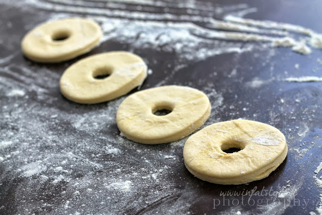 Mit einem Backring stechen wir einen Kreis aus. In der Mitte wird mit einer kleineren Form nochmals ein kleiner Kreis ausgestanzt. So entsteht dabei eine Donut-Form.