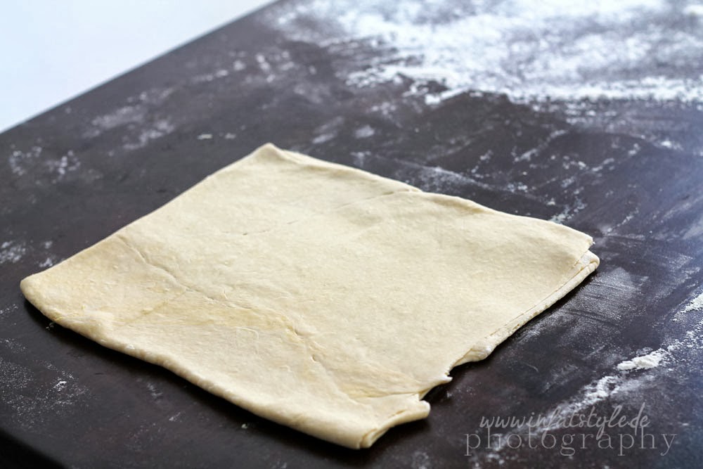 Das Quadrat wird einmal gefaltet und zu einem 4 mm dicken Teig ausgerollt. Das ganze wird ein zweites und ein drittes Mal wiederholt.