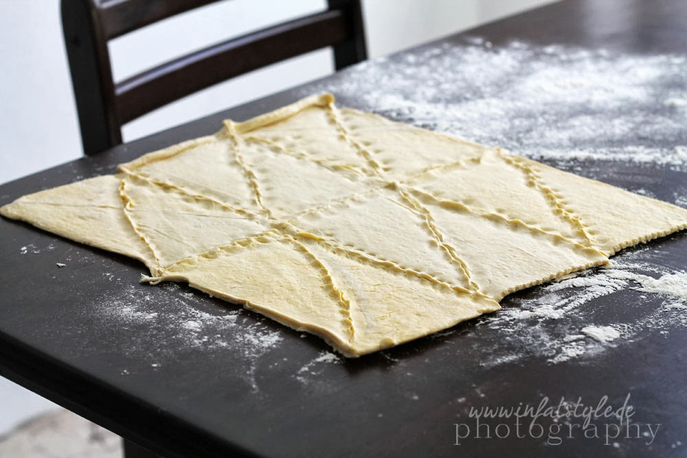 Zunächst legen wir die zwei rollen Backteig auf einer bemehlten Fläche aus. Wir legen jeweils zwei Quadrate untereinander und drücken die ausgestanzten Löcher fest zusammen so dass ein großes Quadrat entsteht.