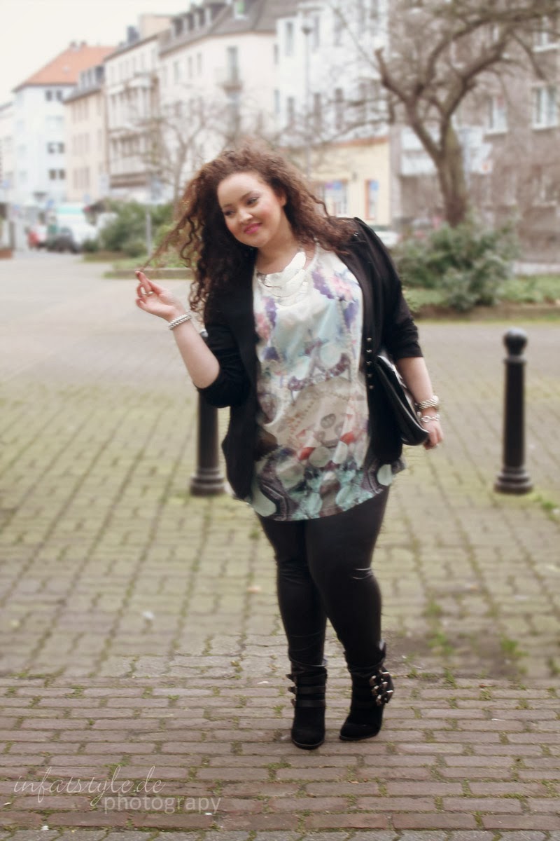 Because it is unfortunately still a bit too cold for the chiffon tunic I wore a jersey blazer from Zizzi still under my biker coat. The blazer has a slight puff sleeves and is decorated with small studs.