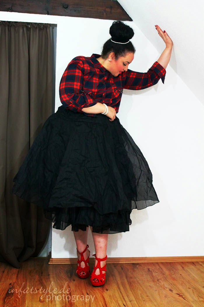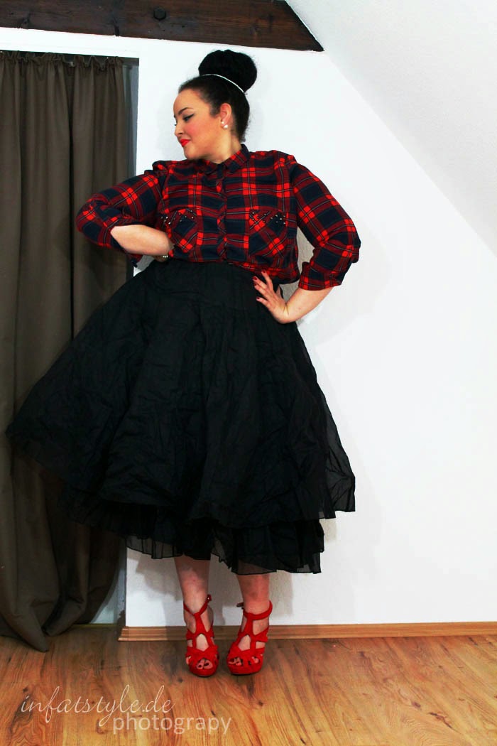 Mit dem ersten Outfit lasse ich die rockige Ballerina wieder aus dem Käfig. Mein voluminöser Midi-Rock von Hebbeding darf dabei natürlich nicht fehlen. Mit den roten Sandalen um meiner Tartan Bluse wirkt der midilange Tutu modern und romantisch zugleich.