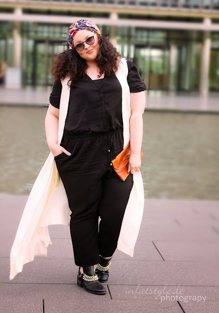Unter meinen Jumpsuits trage ich gewöhnlich Miederwäsche um Beulen vorzubeugen. Mich stören da die Bauchrollen und ich vermeide dieses einfach mit Miederhosen. Sie drücken die Rollen ein und der Jumpsuit sitzt vorne dann nicht mehr so spack. Zur Zeit trage ich die Miss Perfect Miederhosen aus dem Onlineshop www.peterhahn.de . Die Miederhosen findet ihr in der Kategorie Große Größen, bei der Wäsche.